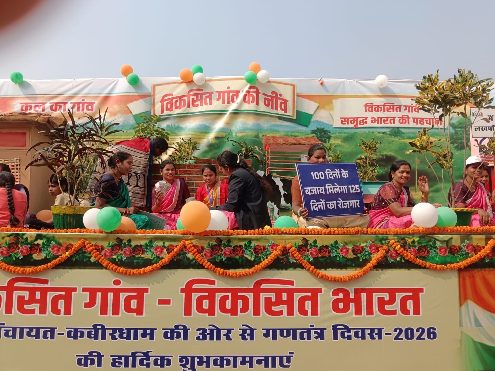 कवर्धा – 26/01/2026, 77 वे गणतंत्र दिवस के अवसर पर जिला स्तरीय कार्यक्रम में जिला पंचायत कबीरधाम की झांकी द्वारा छत्तीसगढ़ की परंपराओं के अनुरूप राउत नाचा पार्टी द्वारा रंगारंग प्रस्तुति द्वारा विकसित भारत गारंटी फ़ॉर रोजगार एंड आजीविका मिशन ग्रामीण की प्रमुख विशेषताएं हजारों दर्शकों को एक साथ बताइए गई ।जिनमे जिले के ग्रामीणों को 125 दिनों का रोजगार, समय पर मजदूरी भुगतान,आजीविका एवं जल संरक्षण के कार्यों को प्राथमिकताएं देते हुए कौशल विकास एवं महिला सशक्तिकरण की दिशा में होने वाले परिवर्तनों की पूरी जानकारी राउत नाचा पार्टी द्वारा नाचते ,गाते, बजाते एवं महिला स्व सहायता समूह द्वारा तख्तियों के माध्यम से दी गई है। इस संबंध में जानकारी देते हुए प्रभारी मुख्य कार्यपालन अधिकारी जिला पंचायत कबीरधाम श्री विनय कुमार पोयाम ने बताया कि जिला पंचायत की झांकी में विकसित भारत जी राम जी योजना से ग्रामीणों को होने वाले फायदों के बारे में जागरूक किया गया। भारत को 2047 तक विकसित राष्ट्र बनाने के लिए योजना से जुड़कर ग्रामीण क्षेत्रों को विकसित करने के प्लान पर जानकारी दी गई। राष्ट्रीय ग्रामीण आजीविका मिशन बिहान योजना की महिला स्व सहायता समूह द्वारा आजीविका की गतिविधियों से जुड़कर लखपति दीदी होने का दर्जा और सम्मान प्राप्त कर महिला सशक्तिकरण की दिशा में नए परचम लहराने का संदेश है।