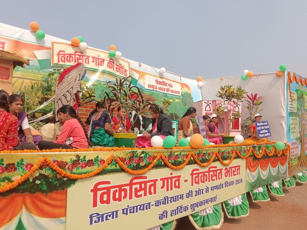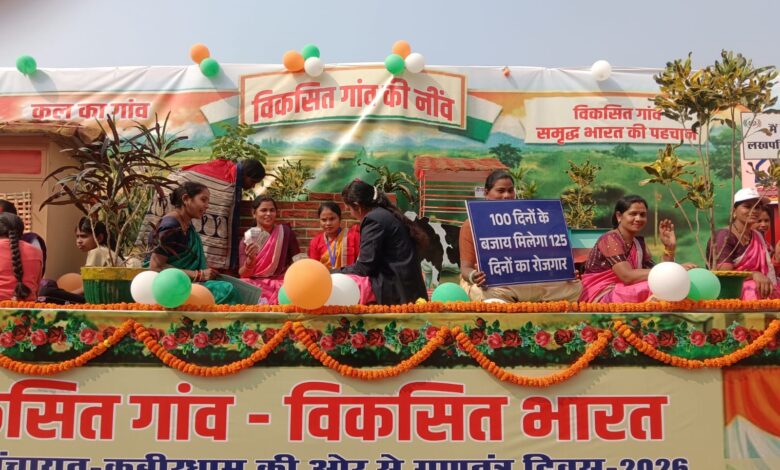 कवर्धा – 26/01/2026, 77 वे गणतंत्र दिवस के अवसर पर जिला स्तरीय कार्यक्रम में जिला पंचायत कबीरधाम की झांकी द्वारा छत्तीसगढ़ की परंपराओं के अनुरूप राउत नाचा पार्टी द्वारा रंगारंग प्रस्तुति द्वारा विकसित भारत गारंटी फ़ॉर रोजगार एंड आजीविका मिशन ग्रामीण की प्रमुख विशेषताएं हजारों दर्शकों को एक साथ बताइए गई ।जिनमे जिले के ग्रामीणों को 125 दिनों का रोजगार, समय पर मजदूरी भुगतान,आजीविका एवं जल संरक्षण के कार्यों को प्राथमिकताएं देते हुए कौशल विकास एवं महिला सशक्तिकरण की दिशा में होने वाले परिवर्तनों की पूरी जानकारी राउत नाचा पार्टी द्वारा नाचते ,गाते, बजाते एवं महिला स्व सहायता समूह द्वारा तख्तियों के माध्यम से दी गई है। इस संबंध में जानकारी देते हुए प्रभारी मुख्य कार्यपालन अधिकारी जिला पंचायत कबीरधाम श्री विनय कुमार पोयाम ने बताया कि जिला पंचायत की झांकी में विकसित भारत जी राम जी योजना से ग्रामीणों को होने वाले फायदों के बारे में जागरूक किया गया। भारत को 2047 तक विकसित राष्ट्र बनाने के लिए योजना से जुड़कर ग्रामीण क्षेत्रों को विकसित करने के प्लान पर जानकारी दी गई। राष्ट्रीय ग्रामीण आजीविका मिशन बिहान योजना की महिला स्व सहायता समूह द्वारा आजीविका की गतिविधियों से जुड़कर लखपति दीदी होने का दर्जा और सम्मान प्राप्त कर महिला सशक्तिकरण की दिशा में नए परचम लहराने का संदेश है।