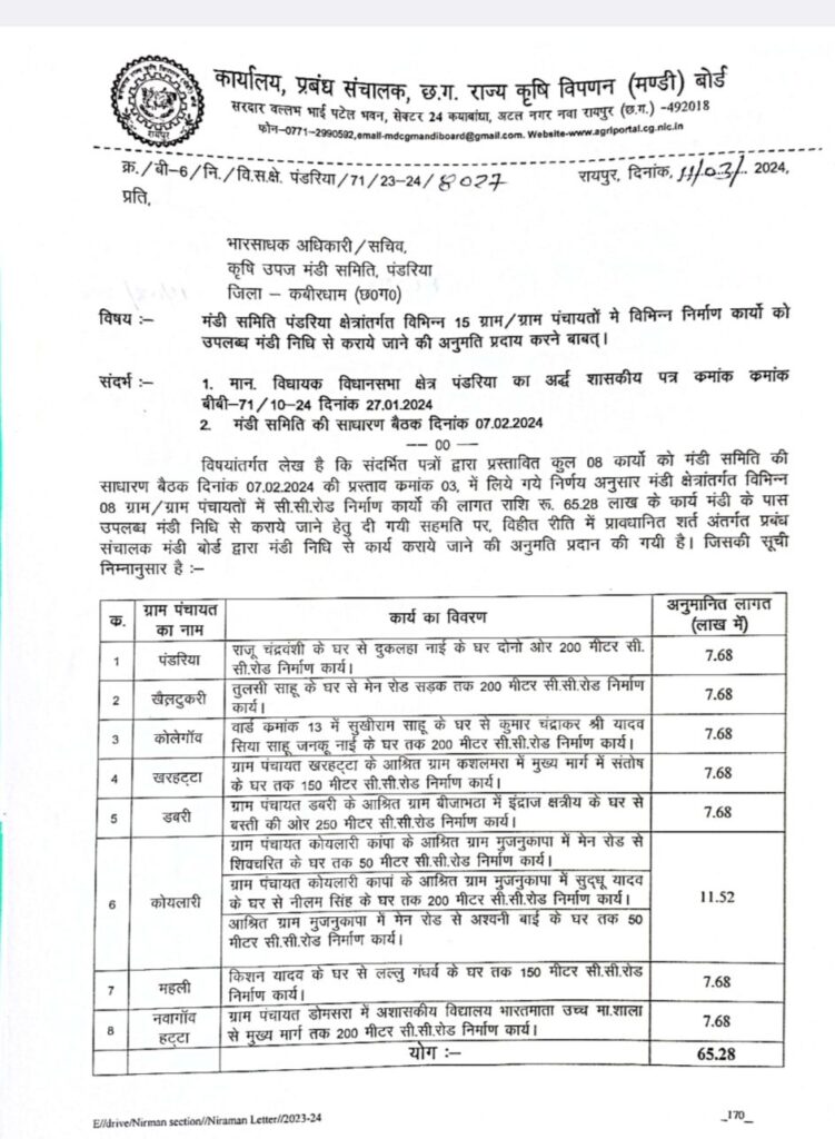 छत्तीसगढ़ मंडी बोर्ड के माध्यम से कुल 8 विकास कार्यों की स्वीकृति मिलने से हमारे ग्रामीण क्षेत्रों में बेहतर सड़क तथा सुगम आवागमन की सुविधा सुनिश्चित होगी. इसके लिए ग्रामीण जनों ने खुशी व्यक्त करते हुए विधायक का आभार प्रकट किया है।