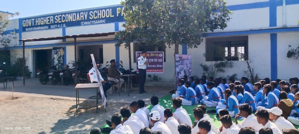 सड़क सुरक्षा माह 2026 के तहत 06 वॉ दिन जन -जागरूकता अभियान के तहत ग्राम पाड़ादाह (खैरागढ़ ) के शासकीय उच्चतर माध्यमिक विद्यालय मे लगभग 120 छात्र /छात्राओं को शिक्षकों की उपस्थिति मे यातायात नियमों की पालन करने, यातायात संकेतक ,सड़क पर चलने के तरीके , राहवीर, CPR,सड़क दुर्घटनाओ से बचाव के तरीके की जानकारी देकर उनके सवालों के जवाब दी गई.यातायात के निर्धारित मानको का पालन करने के साथ दुर्घटनाओ मे घायलों की अधिक से अधिक मदद करने जागरूक किया गया, सड़क दुर्घटनाओ की वर्तमान स्थिति से छात्र /छात्राओं को विशेषकर नाबालिक जो वाहन चलाते है चालक मानको का पूर्ण ज्ञान न होने से आकस्मिक दुर्घटना का शिकार हो जाते है.जिससे दुर्घटनाओ मे वृद्धि परिलक्षित होती है.सड़क सुरक्षा माह के रूप मे जन -जन तक गांव, गली, मोहल्ले, चौक -चौराहा मे यातायात जागरूकता अभियान चलाकर पुरे जनवरी माह मे विभिन्न कार्यक्रमों का आयोजन किया जायेगा.